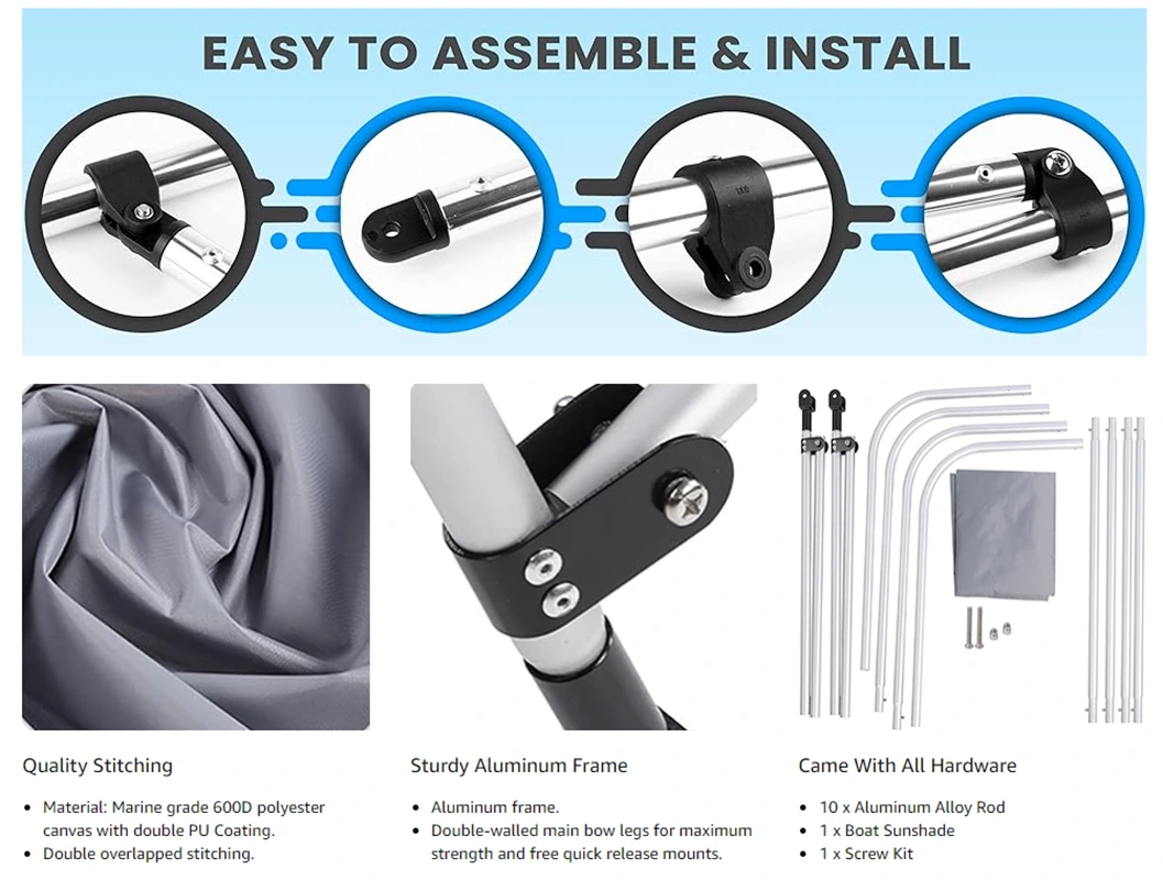 အလူမီနီယမ် Extensible Boat Canopy. ဖောင်းကားနေသော သင်္ဘော၊ ကနူး၊ ကယက်၊ ငါးဖမ်းလှေများအတွက် သင့်လျော်သည်။ ကျွန်ုပ်တို့၏လှေအရိပ်သည် သင့်အား နေနှင့်မိုးဒဏ်မှ ကာကွယ်ပေးသည်၊ Runabout လှေများ၊ V-Hull Boats၊ Jon Boat၊ Bass Boats၊ Inflatable Boats၊ Fiberglass BoatsZhejiang Jiayu Outdoor Products Co., Ltd အတွက် အထူးအထွေမလိုအပ်ဘဲ မိနစ်အနည်းငယ်အတွင်း ပြီးမြောက်နိုင်သည် အလွယ်တကူ လျင်မြန်စွာ တပ်ဆင်နိုင်စေရန်အတွက် tools များ။